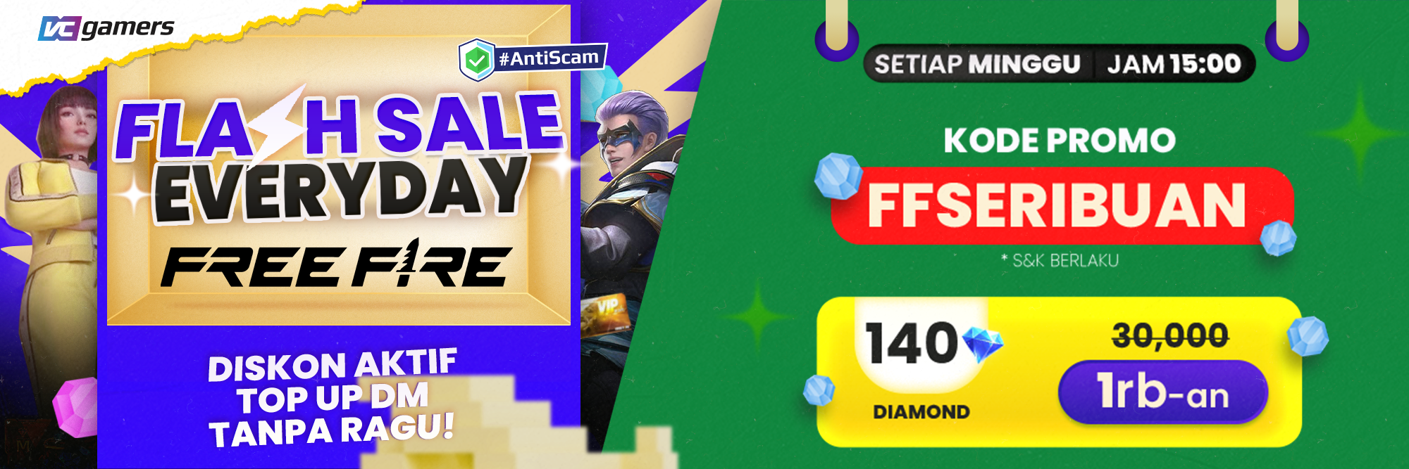 - AMAN: VCGamers adalah Marketplace Game tempat kamu bisa beli voucher dan top up game resmi aman, legal, dan termurah se-Indonesia, kami juga menyediakan produk digital lainnya seperti top up Pulsa semua operator, dan isi token PLN.