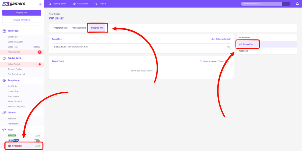 Penjual bisa menemukan Secret Key dan Generate Token yang dibutuhkan untuk proses Integrasi API.