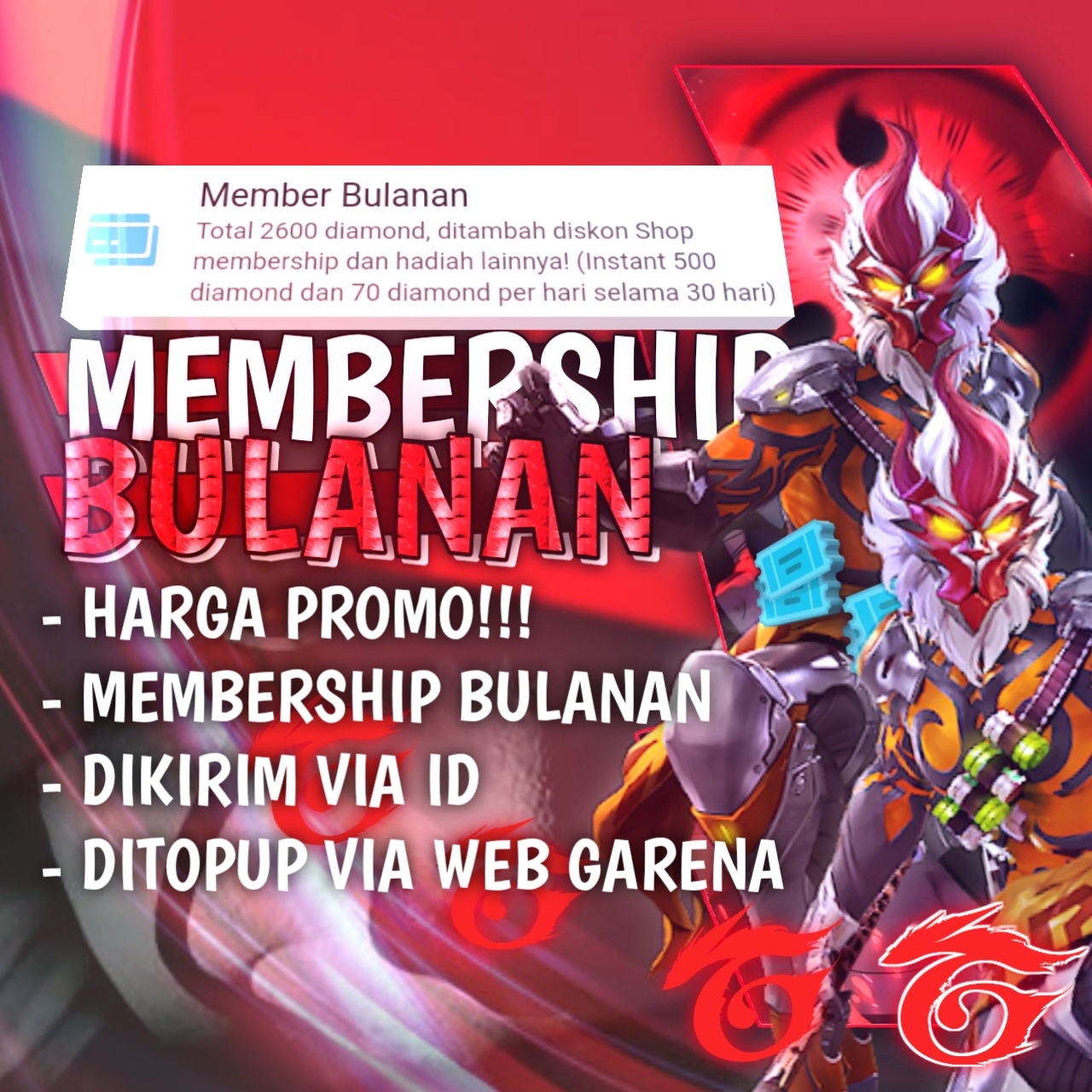 Total 450 diamond + diskon shop membership dan hadiah lainnya ( instan 100 diamond dan 50 diamond perhari selama 7hari )