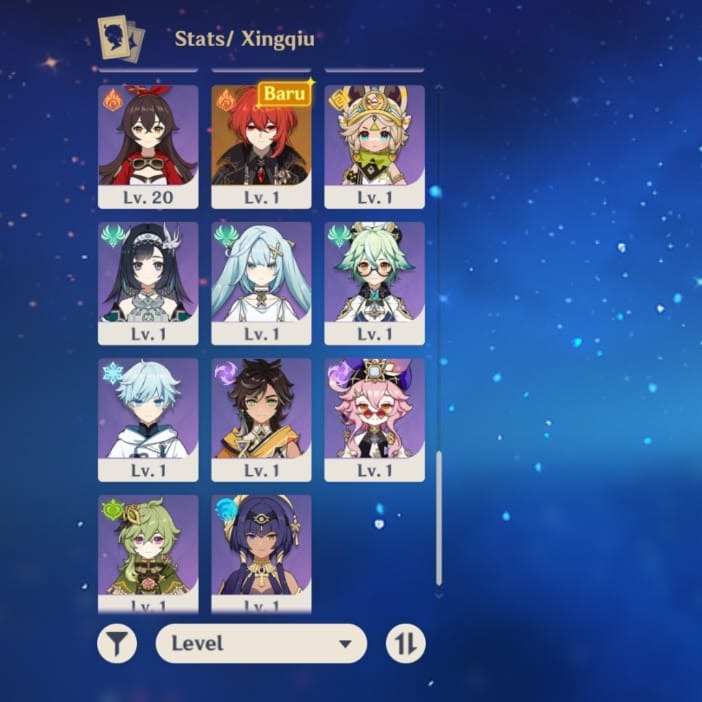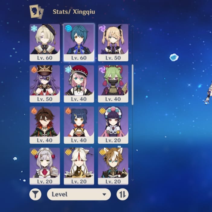 Karakter lain Lv.50-20: Chevreuse, Fischl, Jean, dll. (bisa di-build untuk team variasi). No C6 limited, tapi komposisi tim sudah balance untuk elemental reaction (Vaporize, Electro-Charged). Friendship max di 2 char.