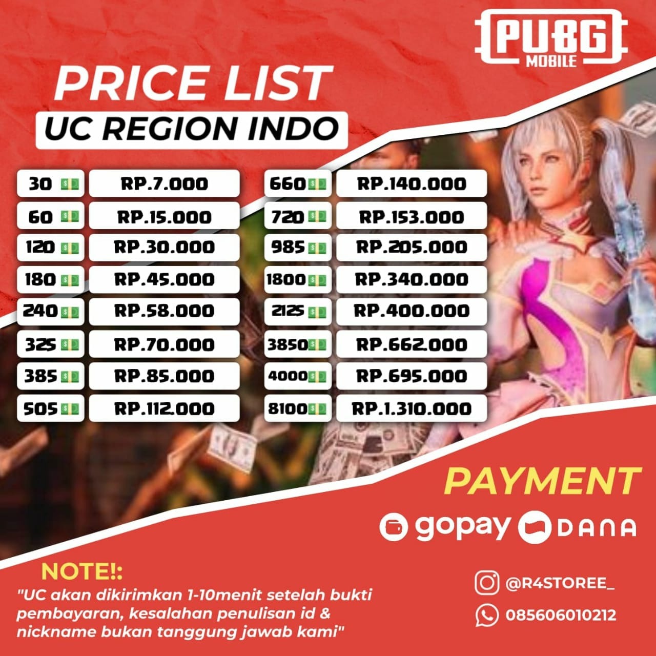 Jual UC PUBG REG INDO Proses cepat 1-5 menit