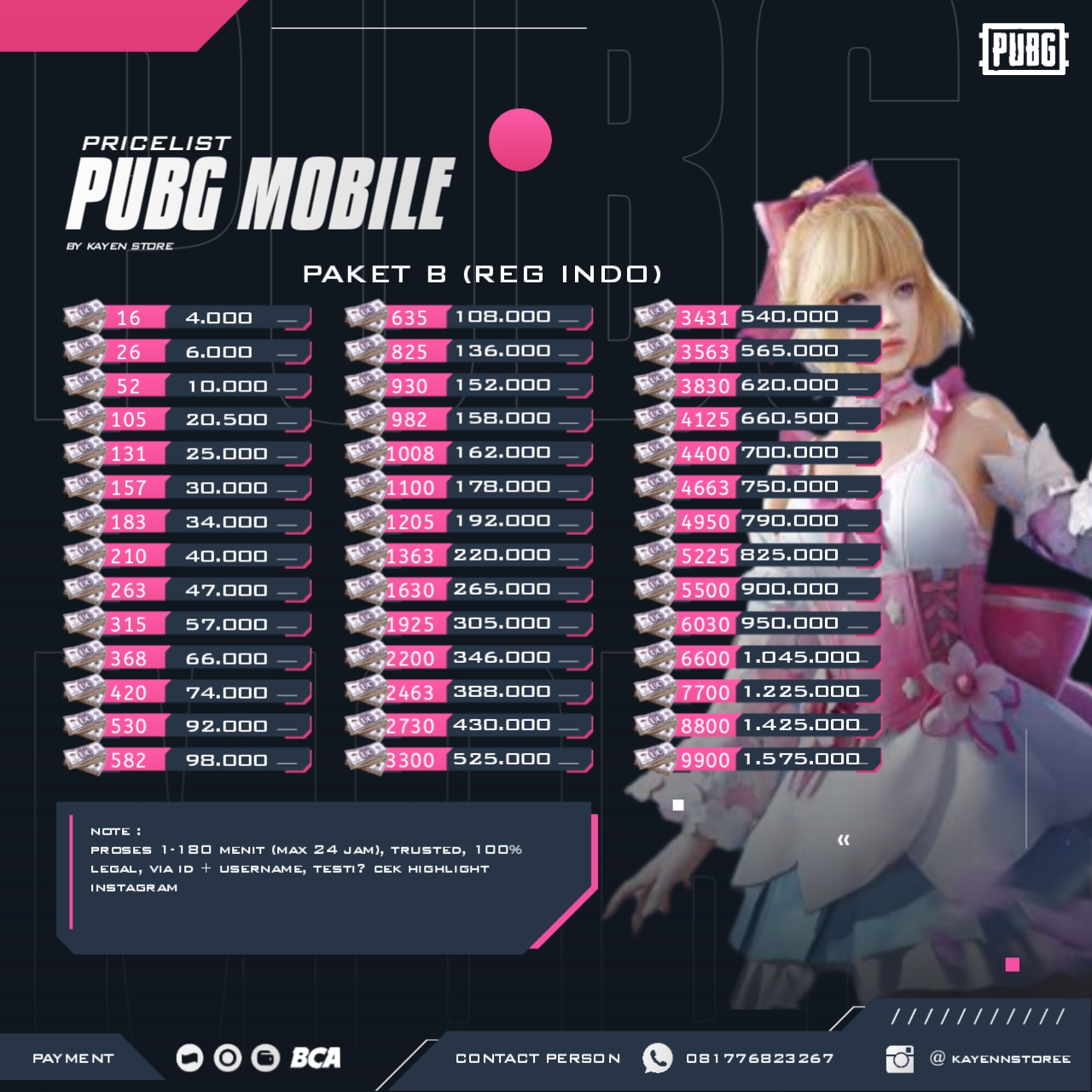 100% legal, proses 1-180 menit (24 jam jika error), region indonesia only, via id dan nickname